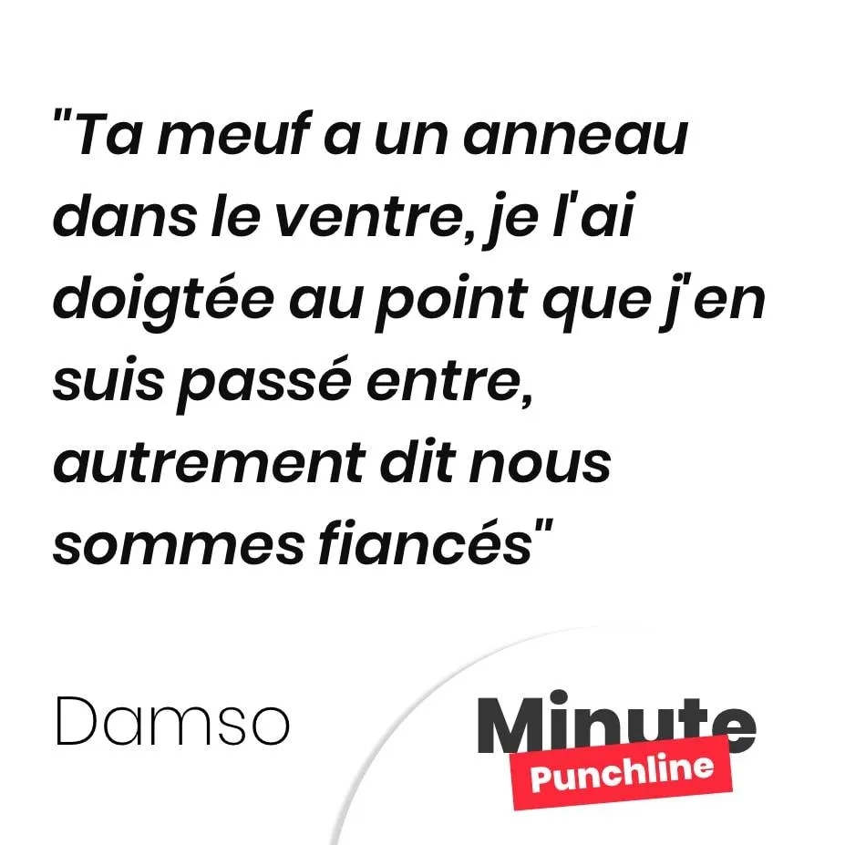 Minute Punchline / Punchline / Damso / Ta meuf a un anneau dans le ventre, je l’ai doigtée au point que j’en suis passé entre, autrement dit nous sommes fiancés