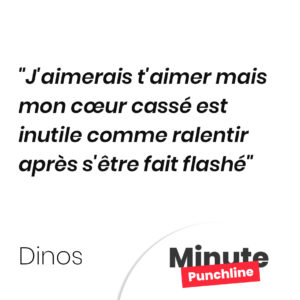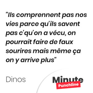 En termes de punchlines, Dinos excelle par son écriture intelligente et son utilisation habile de métaphores et de jeux de mots. Ses paroles, souvent chargées d’émotion et de réflexion, sont à la fois mémorables et impactantes. Cette combinaison de talent lyrique et de sensibilité artistique fait de Dinos un artiste respecté et influent dans le paysage du rap francophone.