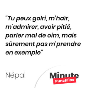 Tu peux golri, m’haïr, m’admirer, avoir pitié, parler mal de oim, mais sûrement pas m’prendre en exemple